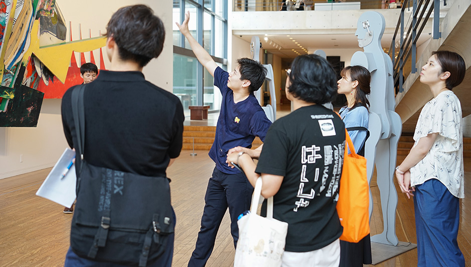 和やかな雰囲気の中で自由に語らい合い、お互いのことを少し知って場がほぐれてきた後は、いよいよ対話型鑑賞の本番です。ファシリテーターと一緒に、ミュージアムのいくつかの作品をグループに分かれて鑑賞し、それぞれの視点で感じたことを言葉で表現していきます。