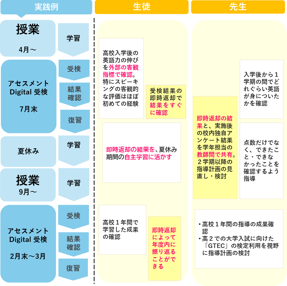 即時返却で結果が確認できることにより、生徒は長期休暇の学習方法や学習計画に活かすことができ、教師は次の学期・学年の開始前に指導計画の議論・検討が可能に。4技能バランスのよい英語力育成指導につながる。