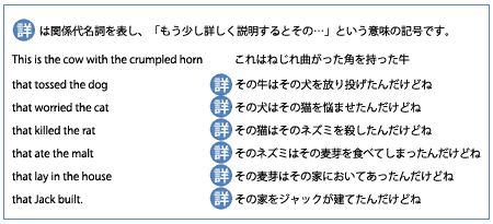 ご存じ、nursery rhyme の代表である、"Mother Goose" の "The House That Jack Built"という有名な「1文」をまねた活動。中学用検定教科書でも取り上げているものがあります。
