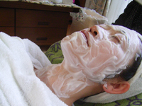 マッサージは、むしタオルで顔をおおい、クリームを使って、お化しょうや、よごれをていねいに落とすところからはじめます。そして、体の中にたまっているよごれが、血えきにのって流れていくように、ツボを意しきしながら、やさしくマッサージ。最後(さいご)に、パックで仕上げをします。