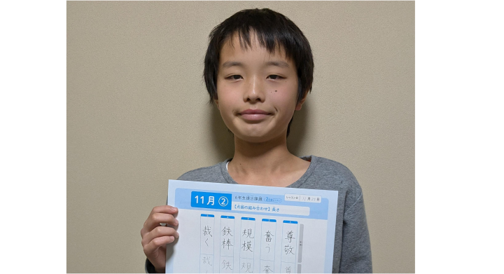 レッスンでは、先生が生徒の書いた字を一人ずつ見てくれる時間があり、アドバイスをくれたり、いいところを具体的にほめてくれます。今までは字を雑に書いて学校の先生に注意されることがありましたが、習字を受講してからはきれいな字を書きたいという気持ちが生まれ、目標をもって取り組ようになり、普段のノートがきれいになりました。