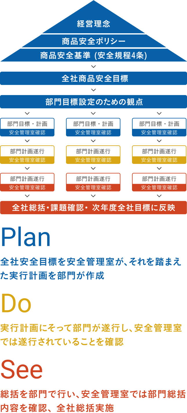 商品に関わるすべての事業部で、安全活動の目標設定・実行・検証サイクルを回す「商品安全PDS」を行っています。専門部署である商品・サービス安全管理室は、目標設定から関わり、それぞれの事業部が適切な推進ができるよう、確認や支援を行っています。