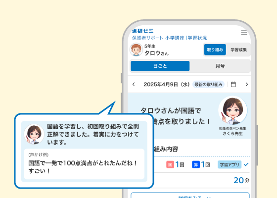 「赤ペン先生」からの学習アドバイスや、声かけ例などで、おうちのかたをサポート!