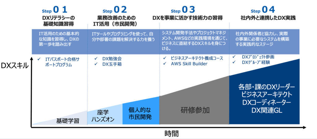 同社では、社内外を巻き込みながらDX推進を実現させていくDX推進人材を段階的に育成するため(図1)、4つのステップから成る育成モデルを構築しています(図2)。