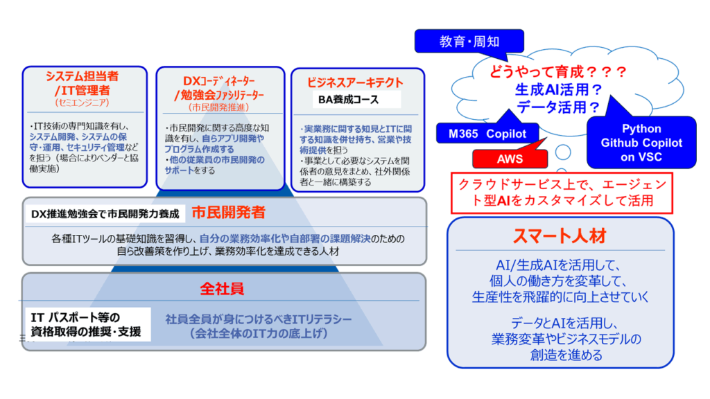 「DXは、断片的な取り組みでは前に進みません。たとえばITパスポートを取得しても、知識をどう実務に活かすのかという道筋がなければ、学びは定着しにくいものです。また、市民開発に挑戦しようとしても、相談できる人や支援する仕組みがなければ実践にはつながりません。だからこそ、個人任せにせず、学びに伴走する勉強会ファシリテーターを研修に配置するなど、学習から実務への接続を支える仕組みを会社として整えることが重要だと考えています」