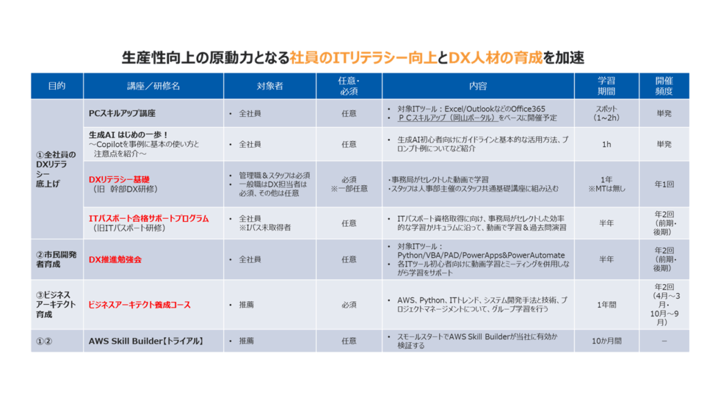 2つ目は、IT初学者への対応です。DX推進を進める中で、デジタルに関する基礎スキルが十分でない従業員がまだ多いことが明らかになりました。そこで、Microsoft OutlookやExcel、Teamsの基本操作を学ぶ「PCスキルアップ講座」を開講しています。