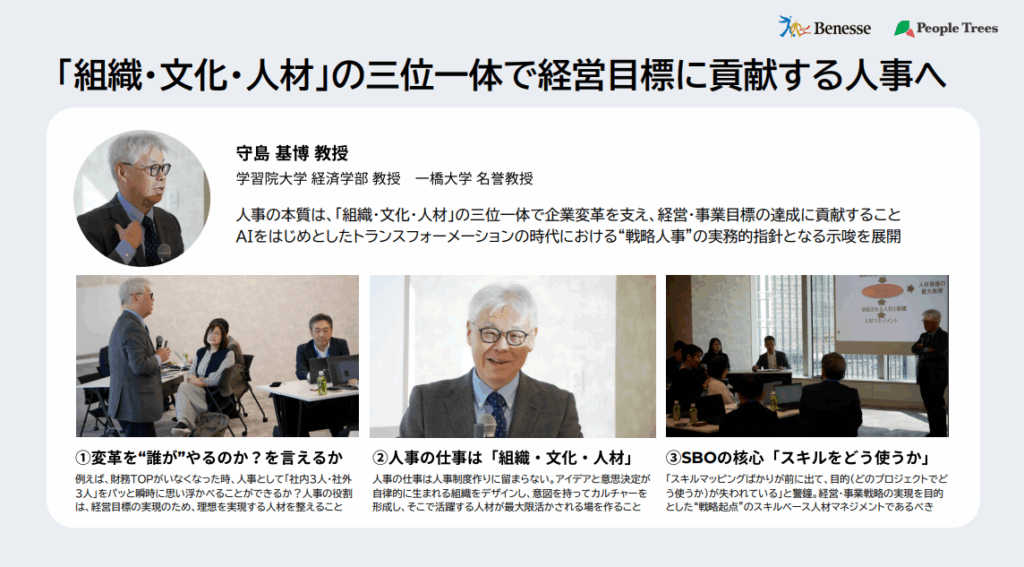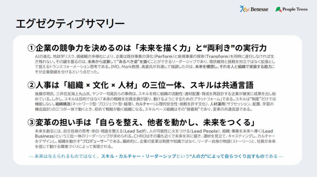 2025年11月に開催した「CHROサミット東京2025」では、IMDのMark Greeven教授をはじめ、三井住友海上火災保険、ヤンマーホールディングスなどの実践企業、そしてベネッセ経営陣・有識者が登壇。スキルベース組織(SBO)への移行、AI時代のリスキリング3.0、そして「組織・文化・人材」の三位一体による変革のリアルを、多角的に議論しました。