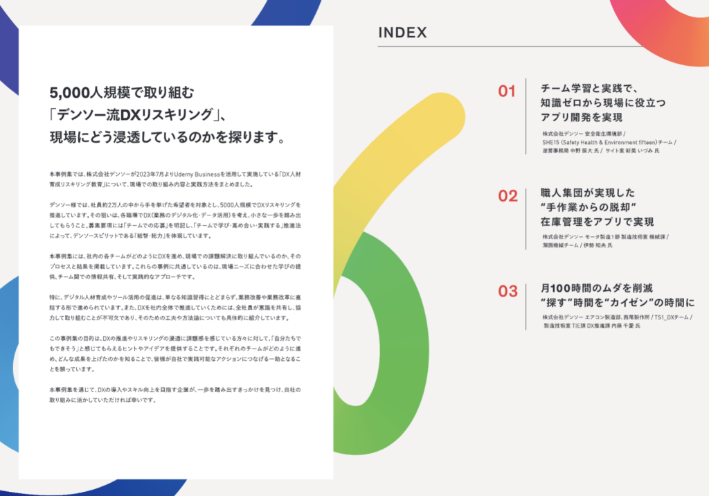 本資料では、株式会社デンソー社が約5,000人規模で展開したDX人財育成の全体像を、実際の現場での変化や成果とともに詳しくご紹介します。どのようにして月100時間のムダを見つけ、削減を行ったのか…単なるeラーニングの導入にとどまらず、業務課題に直結する実践型プログラムを通じて、従業員の意識・行動がどう変わったのか…DX人材育成の先進事例として、ぜひダウンロードのうえご活用ください。