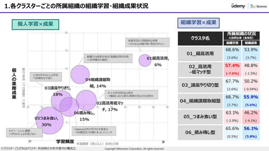 鷹野 組織の実態と比較する中でこのクラスタが実態と合うもの、合わないもの、わからないものがありました。これから、このクラスタを利用して、個人および組織への Push型のインプットを本社主導で実施していこうと考えております。どのような結果になるかをモニタリングしながら、このクラスタの確からしさの確認をしたいと考えております。