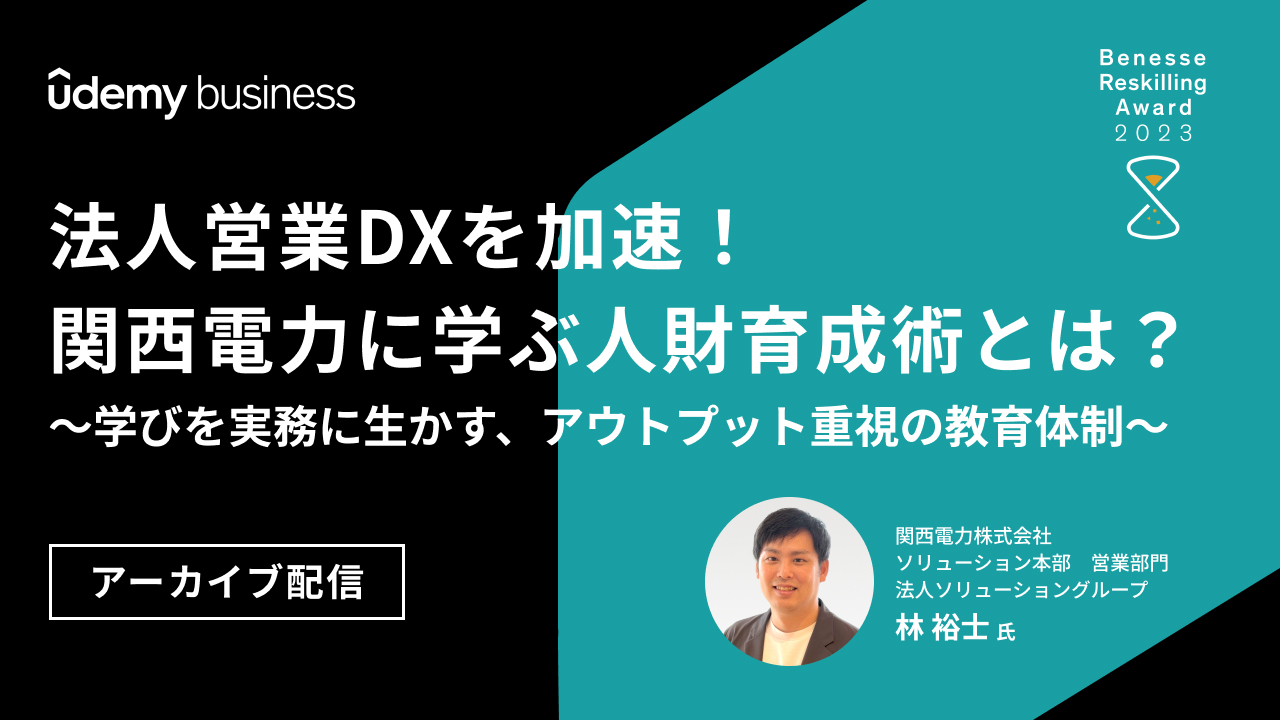 本Webinarでは、関西電力様が実践する法人営業部門のDX人財育成の取り組みを詳しく解説いただきます。関西電力様では、DX人財育成プログラムの設計と実践を通じて、役員層を巻き込んだ実務創出に力を入れています。特に、ベースアップ育成により基礎知識を全員に付与し自分事化させた上で、スペシャリストには実務貢献の機会を提供されているのが特徴です。さらに、実務の中で生まれたDXツールを部門全体で活用することで、業務効率化と育成を同時に実現する好循環が生まれているといいます。事業部主導で生まれた「実務を創出する」育成体系の詳細や、その軌跡を詳しくお伺いします。