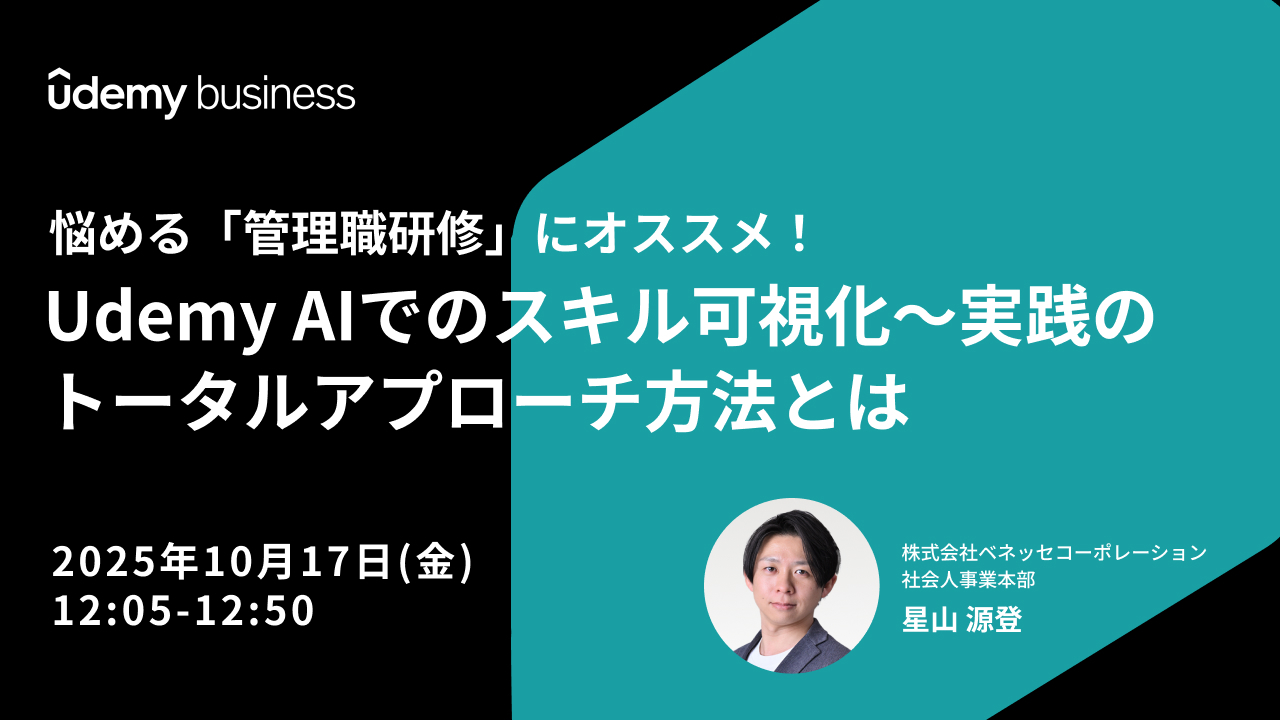 そこで今回のウェビナーでは、管理職のスキル定義・可視化から必要なスキルを獲得するための講座選定、さらに実践までの3ステップのプロセスを、弊社カスタマーサクセスより解説。Udemyの新機能「Udemy AI」を活用し、管理職のスキル向上のための学習カリキュラムがすぐに作成できる方法をご紹介。さらに今年8月に新たに登場したばかりの「Udemy AI Roleplay」で実践練習についてもご紹介します!この機会に、管理職育成にかかる複雑なスキル可視化の工数を軽減し、より効果的な人材開発の方法をぜひ学んでください。