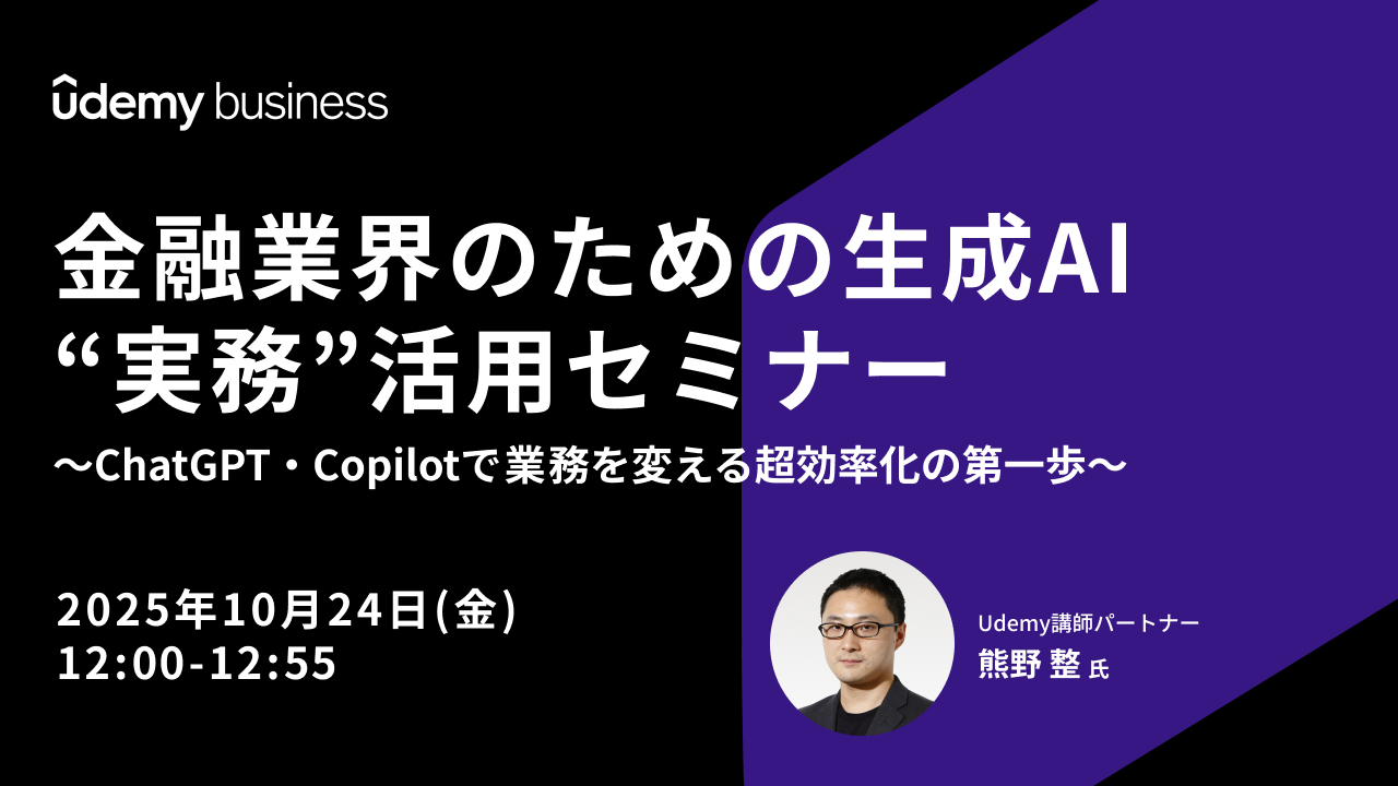 今回のセミナーでは、生成AIを活用した業務効率化・スキル習得法に精通し、企業研修でも高い評価を得ている講師・熊野整氏を迎え、金融業界の実務に即した「使える」生成AI活用法をお届けします。