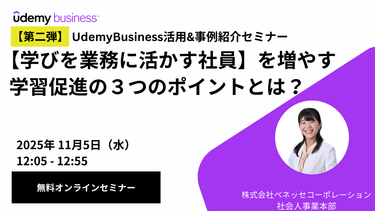 さらに、実際にUdemy Businessを導入し、社員が学んだ知識を業務の成果に結びつけるようになった企業の事例を紹介しながら、学習定着を促す具体的なアプローチについてもお伝えします。