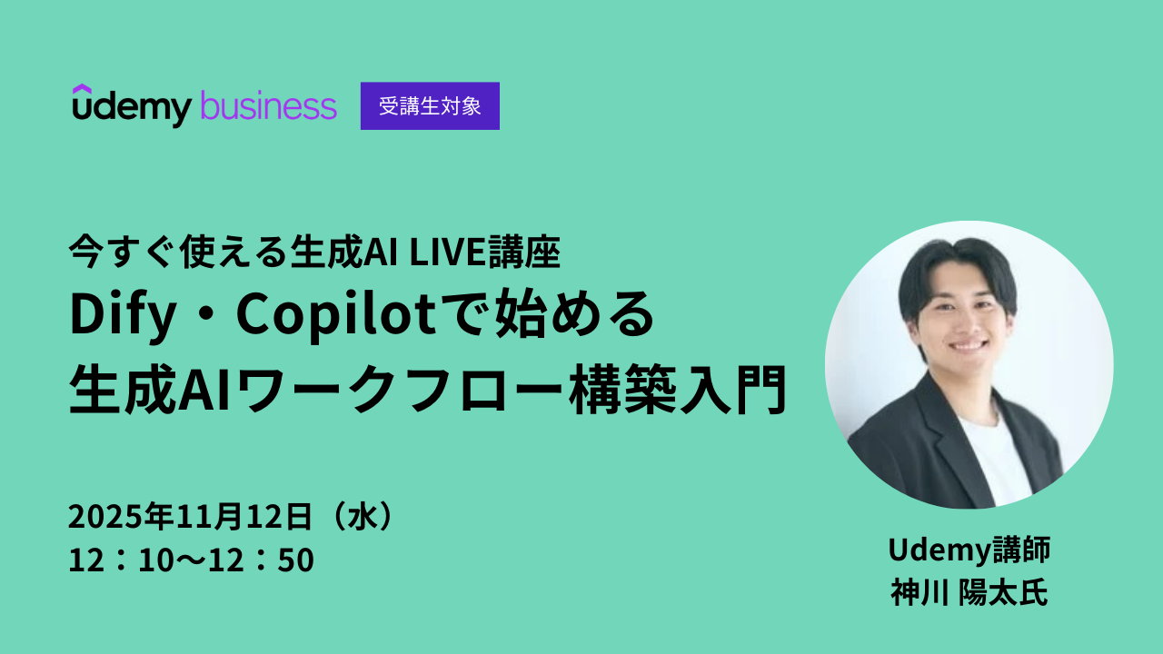 本LIVE講座では、注目のプラットフォーム「Dify」とRAG技術を組み合わせて、実際に社内専用のAIワークフローを構築する方法を学びます。「AIワークフロー」と「AIエージェント」の違いまで、実務に直結する形で業務自動化について体系的に解説します。またMicrosoft Copilotを使ったAIワークフロー構築法のコツも教えていただきます。