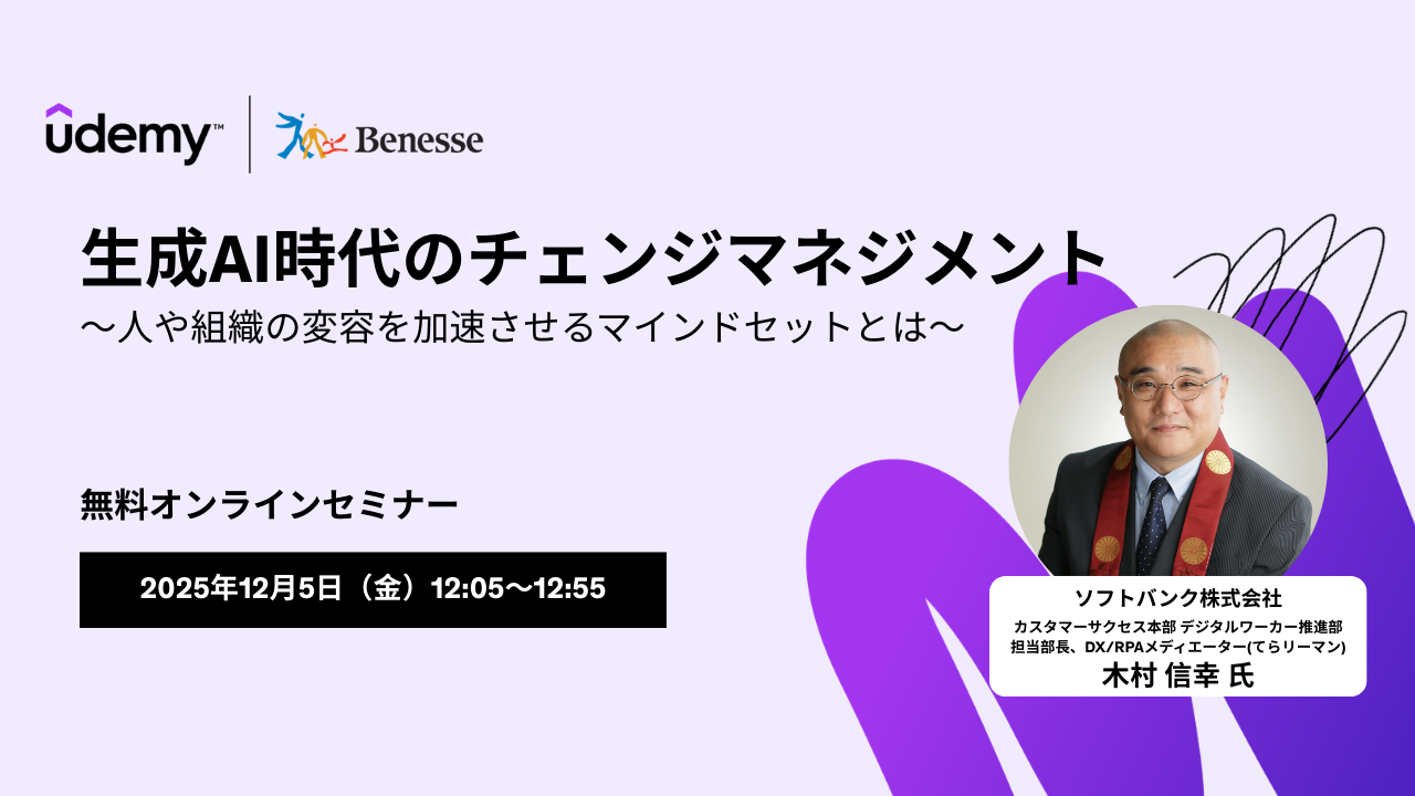 本Webinarでは、生成AI時代に人と組織が健やかに変化していくための「チェンジマネジメント」に焦点を当てます。ソフトバンクにおける社内DXの旗振り役であると同時に、“てらリーマン 慈永”として仏教の教えを説くお坊さんでもある木村氏を迎え、AI活用の核心にある「ひとのこころ」、そして管理職が陥りやすい実力評価の盲点を紐解きます。「AIはひとに依存する技術である」と喝破する木村氏が、AIと人をどう結び付け、組織文化を変革していくのか——その“鍵となる視点”をお届けします。