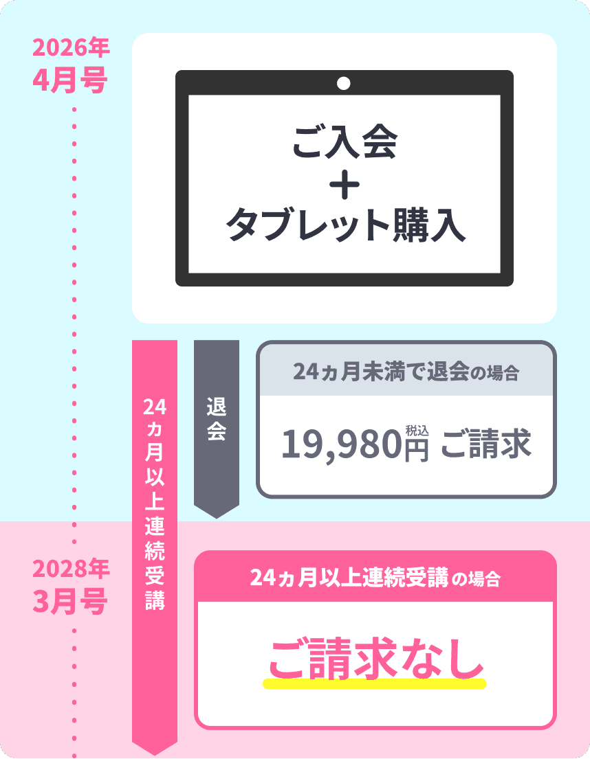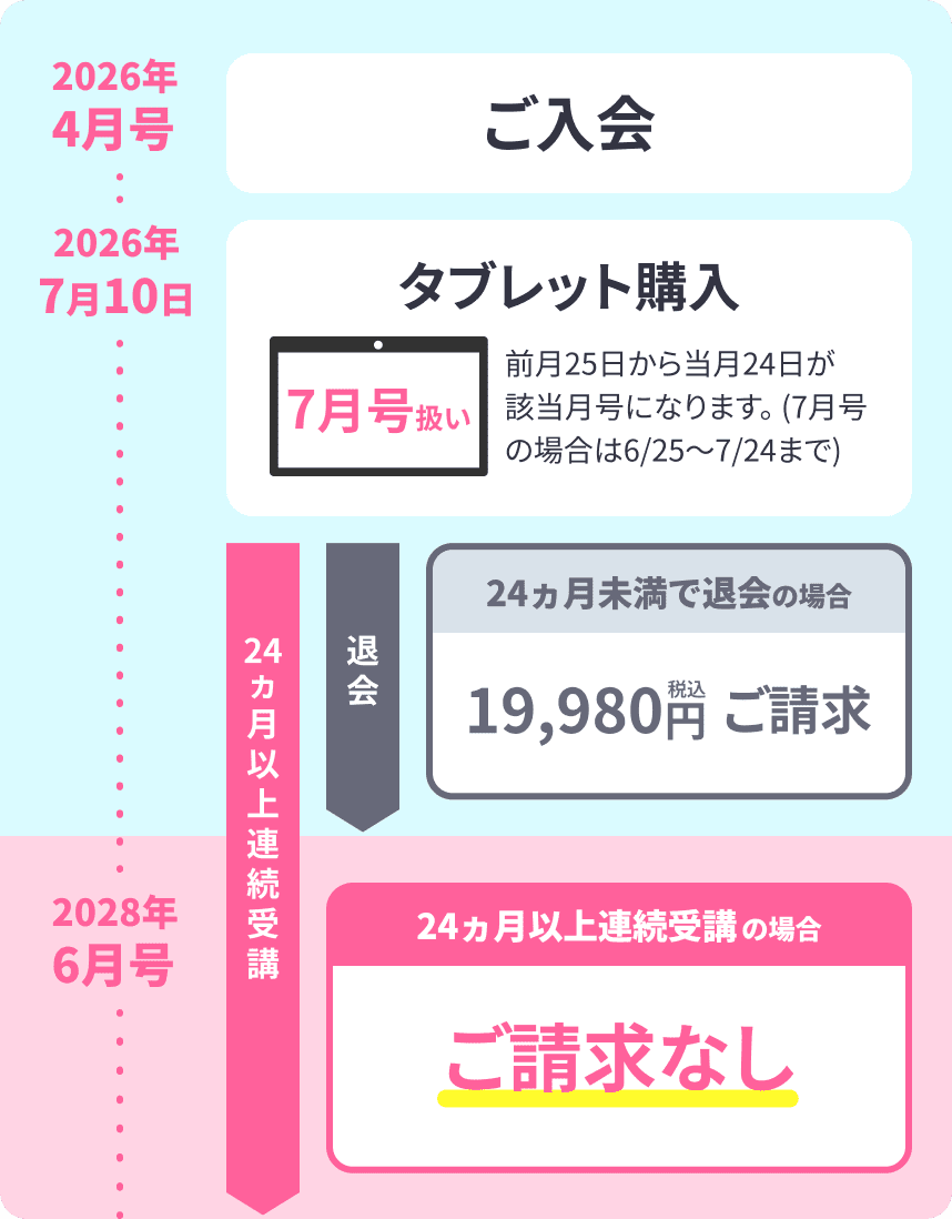 タブレットを購入いただいた日の月号を1ヵ月目とし、そこから24ヵ月以上受講いただいた場合に19,980円の請求はなしとなります。