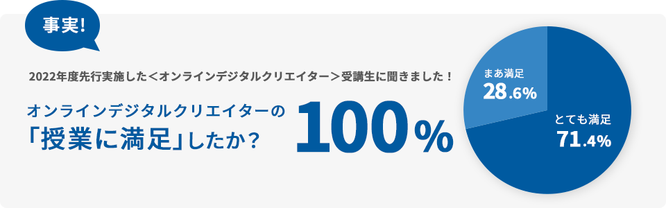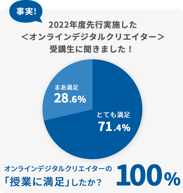 ※2022年9月「デジタルクリエイタートライアル授業終了後アンケート」より、 設問「授業に満足しましたか?」に対して「とても満足した」「まぁ満足した」と回答した合計数より算出。