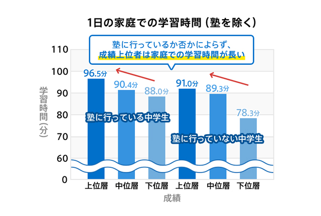調査結果を見ると、成績上位者は塾に通っている・いないに関わらず、1日の家庭での学習時間が長いことがわかります。このことから家庭学習の習慣をつけることが、成績UPへの近道だといえそうです。