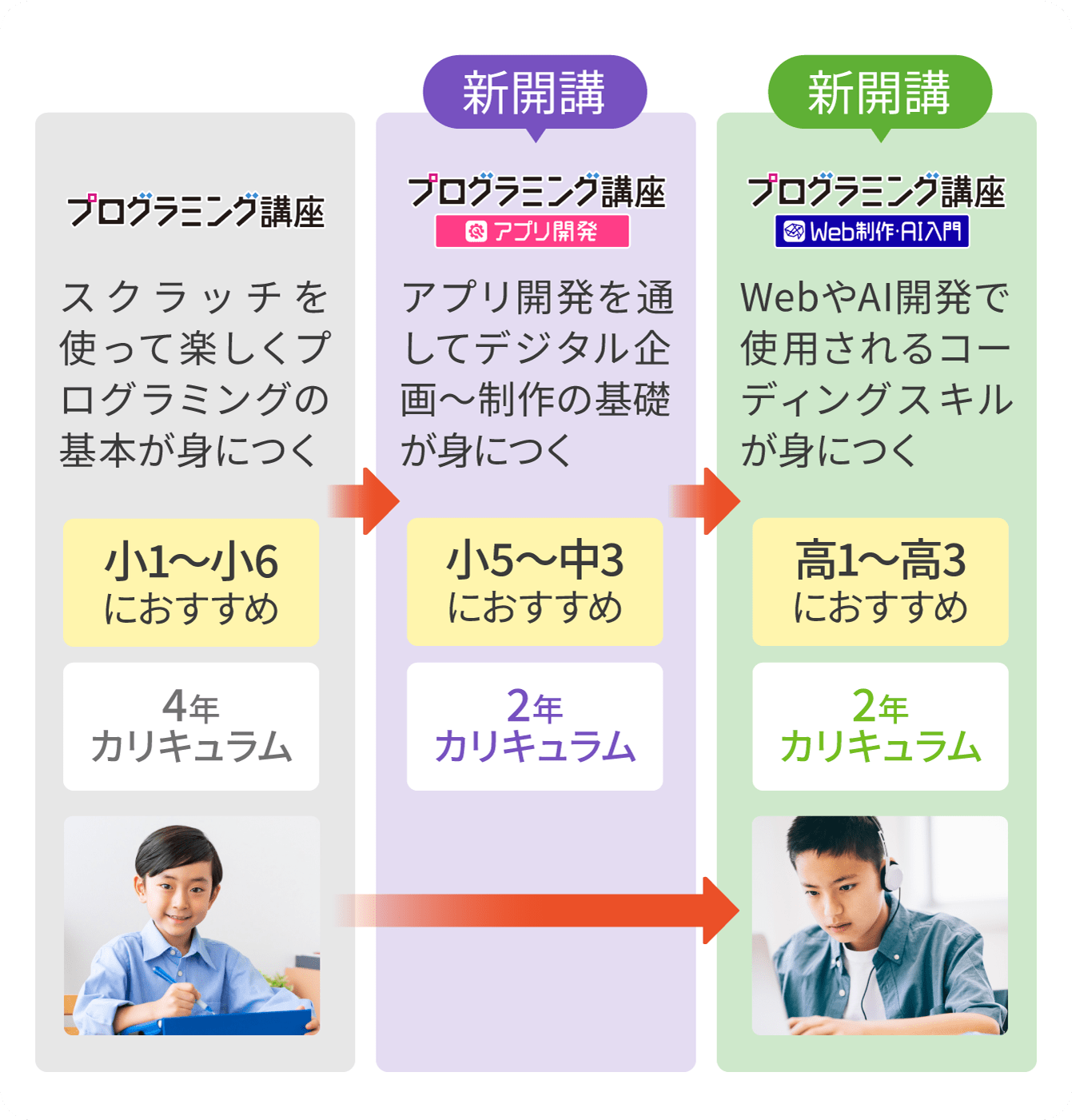 2025年4月に「アプリ開発」と「Web制作・AI入門」が新開講し、一貫したカリキュラムが完成しました。「どこからでも始められる」「スキップも可能」の設計です。