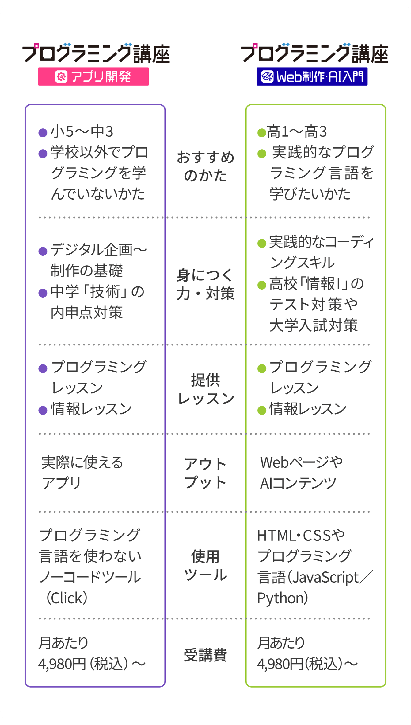 - ※「アプリ開発」「Web制作・AI入門」とも受講費は同額です。