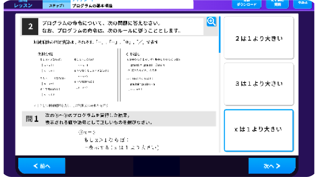 情報レッスンは<チャレンジパッド>での学習が可能ですが、プログラミングレッスンの学習には標準動作環境を満たしたPC環境が必要で、<チャレンジパッド>での学習はできません。標準動作環境を満たしたPC環境をご準備ください。